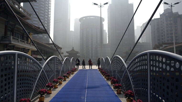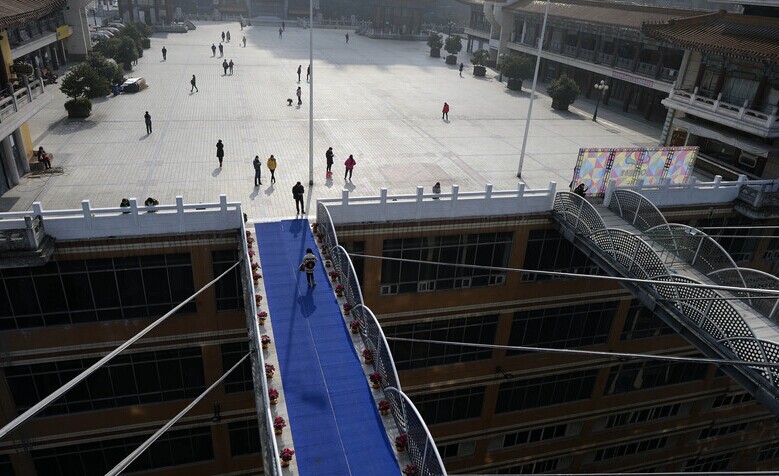 2014年12月29日,重庆解放碑附近一新建楼盘,为了出入方便,在22层高楼的外墙上,分别搭建了两个钢结构的人行天桥。