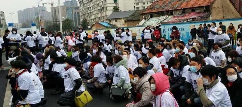 1月28日,据多名网友微博爆料:金华万达广场门口再次聚集了数百维权退房的业主,他们身穿白色T恤,上面印有黑色“无信”、“退房”等字样。图片来源网络