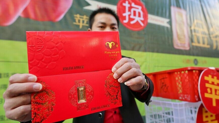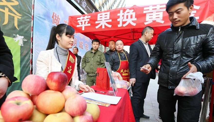 2014年12月23日,郑州二七路一珠宝广场,200多位市民排起了数十米长队,拿着苹果等待换黄金。据介绍,为了迎圣诞节,凡持一对苹果到金鑫珠宝正弘店,即可免费兑换迷你“招财金”小金条一个。